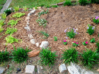 There's still a significant bald spot, as you can see in the photograph below, that needs to be filled. I am thinking of getting two more plants like the one I have in the smaller plot that attracts the butterflies. It makes a terrific sprawling ground cover, with vivid orange and red blossoms. I also bought Creeping Jenny, which remind me of a girl's thin curly locks for some reason. These I planted in the lower portion of the flower bed, and added a tier-like boarder out of rocks to help with irrigation.